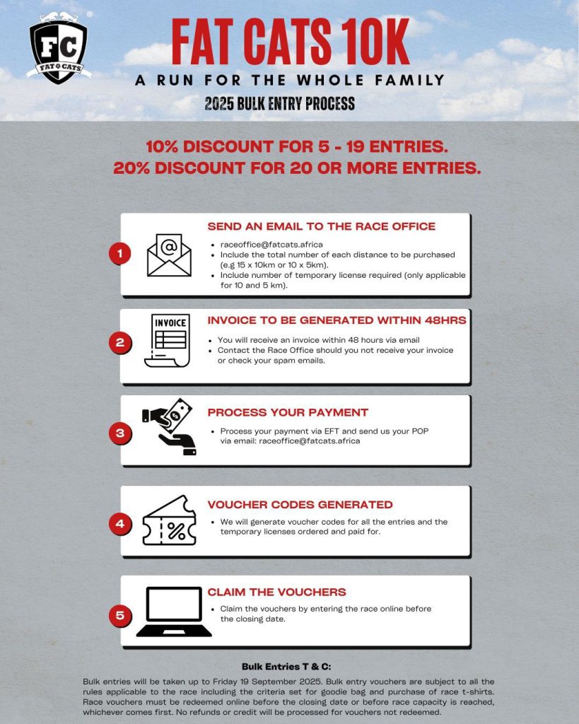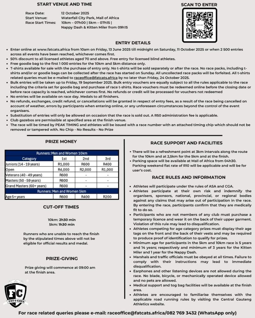 For any further question you may have, please e-mail the race office on raceoffice@fatcats.africa